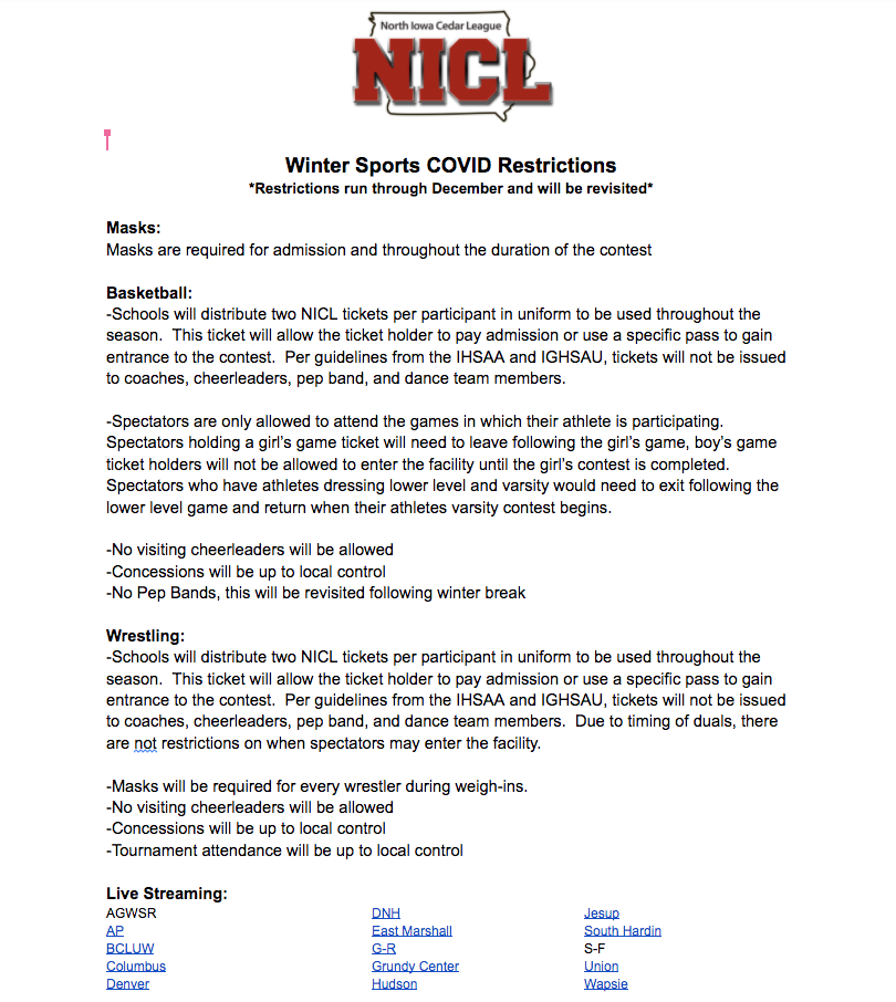 Please refer to the graphic below regarding important COVID-related restrictions for winter sports. The restrictions will be enforced through the month of December, then reevaluated.