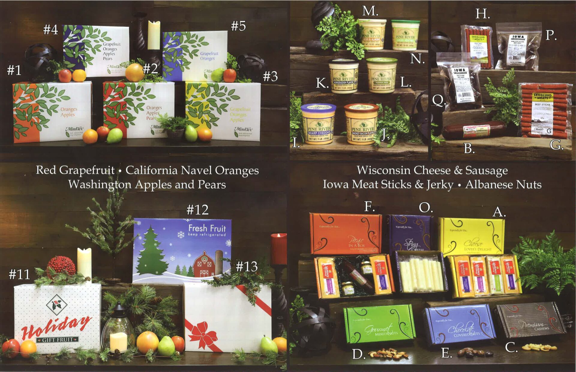 As in years past the fruit is from Minntex and features Texas Red Grapefruit, California Navel Oranges, and Washington Apples and Pears in three different box sizes and various combinations of fruit. There are also non-mixed options available including 30- and 40-pound boxes of citrus, three different sizes of apple boxes, and two sizes of pear boxes. Rounding out the fruit line-up are individual pineapples and 5-pound boxes of clementine mandarin oranges.