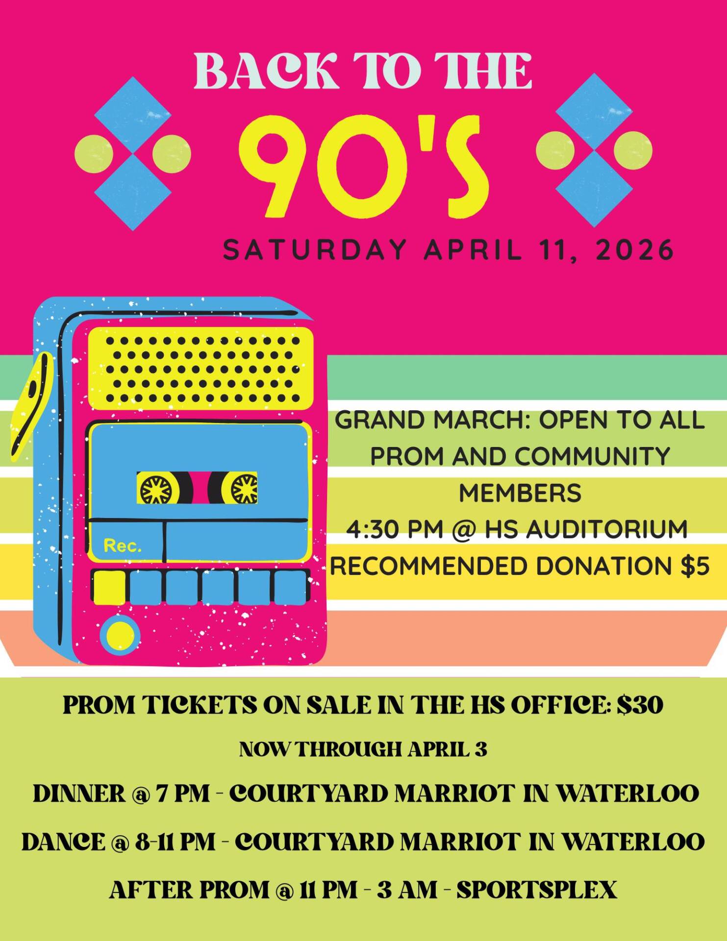 Join us for the grand march at 4:30pm in the high school auditorium, followed by dinner at 7:00pm at the Courtyard Marriott in Waterloo. Dancing will take place from 8:00 to 11:00pm, and after prom will begin at 11:00pm at Sportsplex.